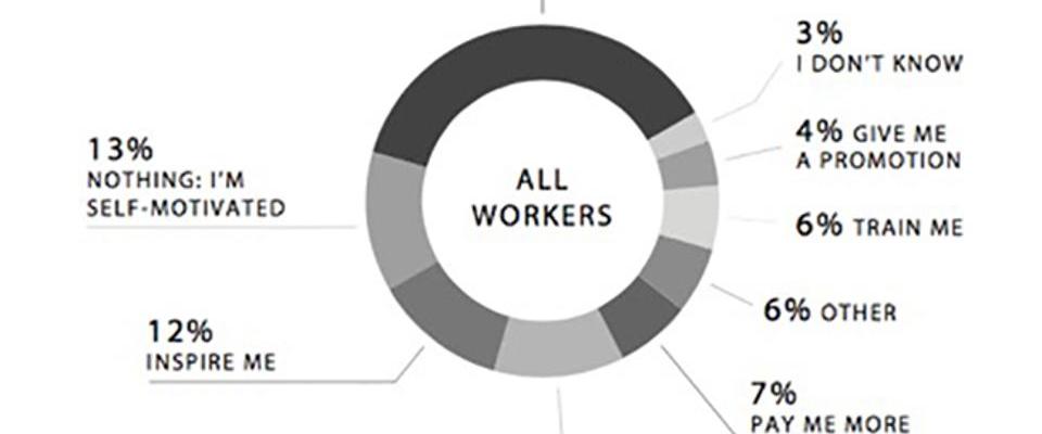 The report suggests 37% of all workers want to be recognize, 13% are self-motivated and do not want anything. Whereas 12% workers say inspire me, another 12% want more autonomy, 7% more pay, 6% other, 6% training, 4% want a promotion, and 3% do not know.